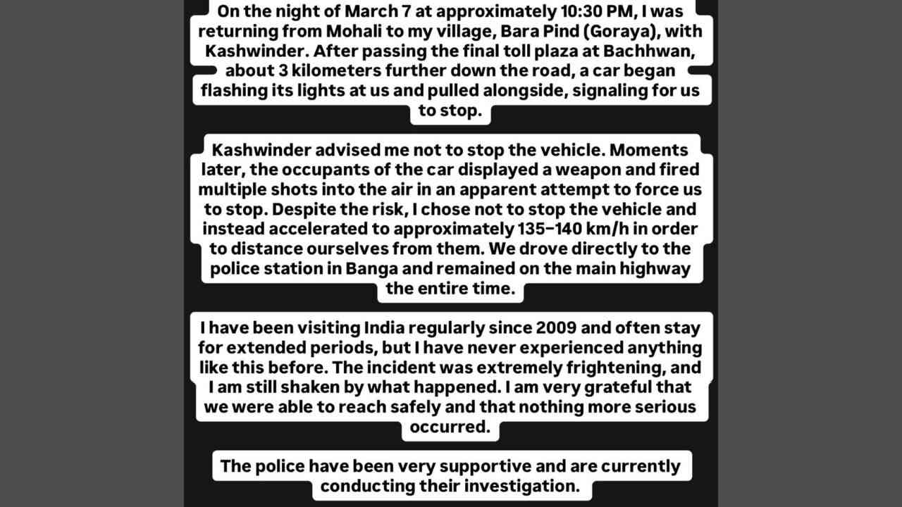 ਗਾਇਕ ਮੁਤਾਬਕ ਨਵਾਂਸ਼ਹਿਰ ਦੇ ਨਜ਼ਦੀਕ ਅਣਪਛਾਤੇ ਬਦਮਾਸ਼ਾਂ ਨੇ ਉਸ ਦੀ ਕਾਰ ਦਾ ਪਿੱਛਾ ਕੀਤਾ ਅਤੇ ਉਸ ‘ਤੇ ਹਮਲੇ ਦੀ ਕੋਸ਼ਿਸ਼ ਕੀਤੀ ।ਇਸ ਦੌਰਾਨ ਬਦਮਾਸ਼ਾਂ ਨੇ ਉਨ੍ਹਾਂ ਨੂੰ ਡਰਾਉਣ ਦੇ ਲਈ ਹਵਾਈ ਫਾਇਰ ਵੀ ਕੀਤੇ, ਪਰ ਉਨ੍ਹਾਂ ਨੇ ਆਪਣੀ ਕਾਰ ਨਹੀਂ ਰੋਕੀ ਅਤੇ ਇਸੇ ਦੌਰਾਨ ਬਦਮਾਸ਼ਾਂ ਨੇ ਫਾਇਰ ਕੀਤੇ ਤੇ ਮੌਕੇ ਤੋਂ ਫਰਾਰ ਹੋ ਗਏ ।