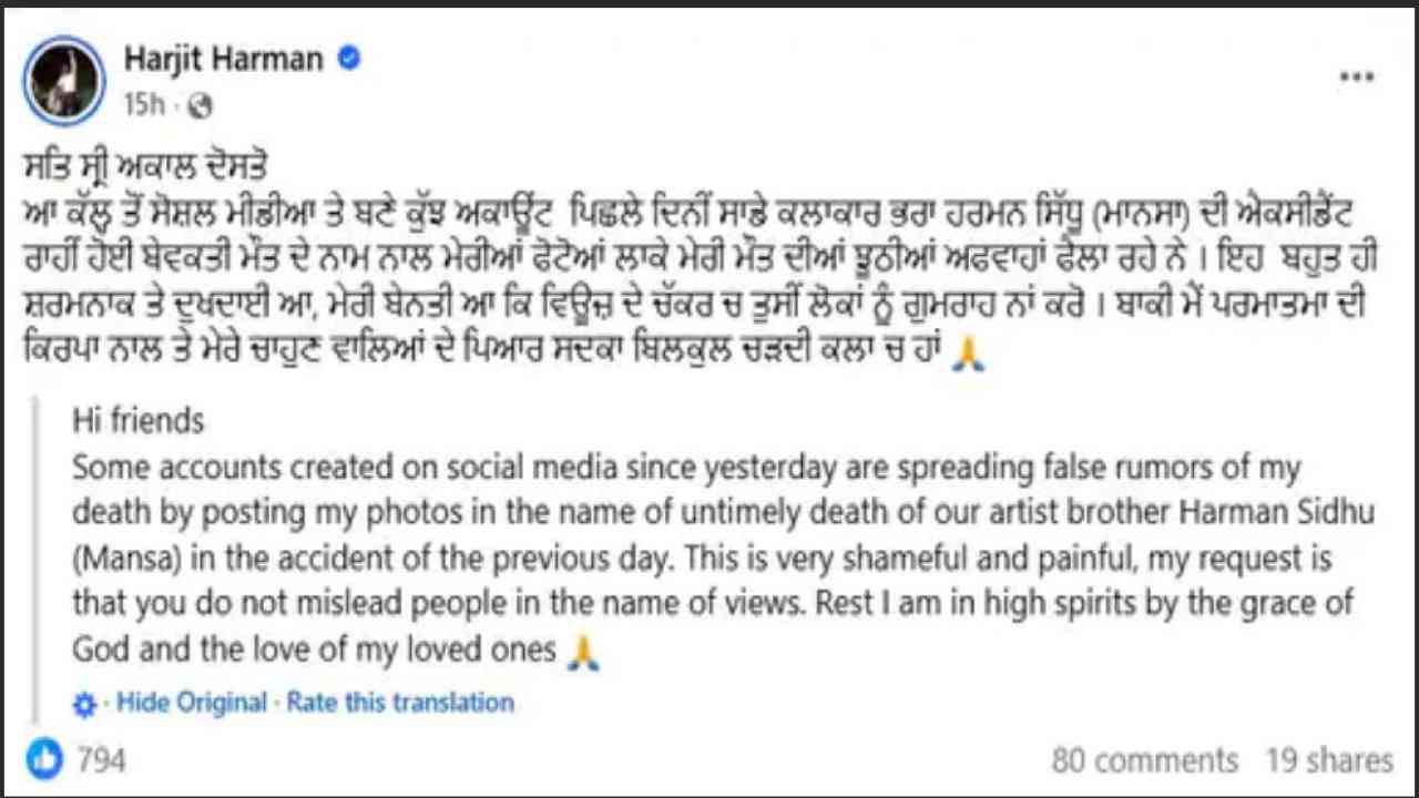 ਗਾਇਕ ਹਰਮਨ ਸਿੱਧੂ ਦੀ ਮੌਤ ਦੀ ਖ਼ਬਰ ਨੂੰ ਅਫਵਾਹ ਦੱਸਦਿਆਂ ਹਰਜੀਤ ਹਰਮਨ ਨੇ ਆਪਣੇ ਫੇਸਬੁੱਕ ਪੇਜ ਤੇ ਪੋਸਟ ਸਾਂਝੀ ਕੀਤੀ ਹੈ। ਜਿਸ ‘ਚ ਉਨ੍ਹਾਂ ਨੇ ਲਿਖਿਆ ‘ਸਤਿ ਸ੍ਰੀ ਅਕਾਲ ਦੋਸਤੋ,ਆ ਕੱਲ੍ਹ ਤੋਂ ਸੋਸ਼ਲ ਮੀਡੀਆ ਤੇ ਬਣੇ ਕੁੱਝ ਅਕਾਊਂਟ ਪਿਛਲੇ ਦਿਨੀਂ ਸਾਡੇ ਕਲਾਕਾਰ ਭਰਾ ਹਰਮਨ ਸਿੱਧੂ (ਮਾਨਸਾ) ਦੀ ਐਕਸੀਡੈਂਟ ਰਾਹੀਂ ਹੋਈ ਬੇਵਕਤੀ ਮੌਤ ਦੇ ਨਾਮ ਨਾਲ ਮੇਰੀਆਂ ਫੋਟੋਆਂ ਲਾਕੇ ਮੇਰੀ ਮੌਤ ਦੀਆਂ ਝੂਠੀਆਂ ਅਫਵਾਹਾਂ ਫੈਲਾ ਰਹੇ ਨੇ ।
