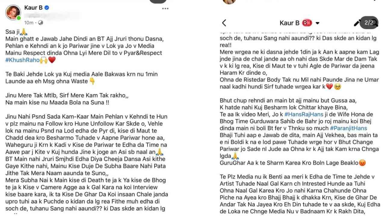 ਕੌਰ ਬੀ ਨੇ ਲੰਮੀ ਚੌੜੀ ਪੋਸਟ ਸਾਂਝੀ ਕਰਦੇ ਹੋਏ ਲਿਖਿਆ ‘ਮੌਤ ਤਾਂ ਛੱਡ ਦਿਓ ਬੇਸ਼ਰਮੋਂ, ਤੁਹਾਡੇ ਵੀ ਪਰਿਵਾਰ ਹੋਣਗੇ। ਵਾਹਿਗੁਰੂ ਕਰੇ ਕਿ ਕਿਸੇ ਦੇ ਵੀ ਪਰਿਵਾਰ 'ਤੇ ਇਸ ਤਰ੍ਹਾਂ ਦਾ ਸਮਾਂ ਨਾ ਆਵੇ’ । ਇਸ ਦੇ ਨਾਲ ਹੀ ਗਾਇਕਾ ਨੇ ਉਨ੍ਹਾਂ ਫੈਨਸ ਤੇ ਚਾਹੁਣ ਵਾਲਿਆਂ ਦਾ ਵੀ ਧੰਨਵਾਦ ਕੀਤਾ ਜੋ ਉਨ੍ਹਾਂ ਦੇ ਹੱਕ ‘ਚ ਖੜ੍ਹੇ ਹਨ । ਗਾਇਕਾ ਨੇ ਇਸ ਲੰਮੀ ਚੌੜੀ ਪੋਸਟ ‘ਚ ਹੋਰ ਵੀ ਬਹੁਤ ਕੁਝ ਲਿਖਿਆ ਹੈ।