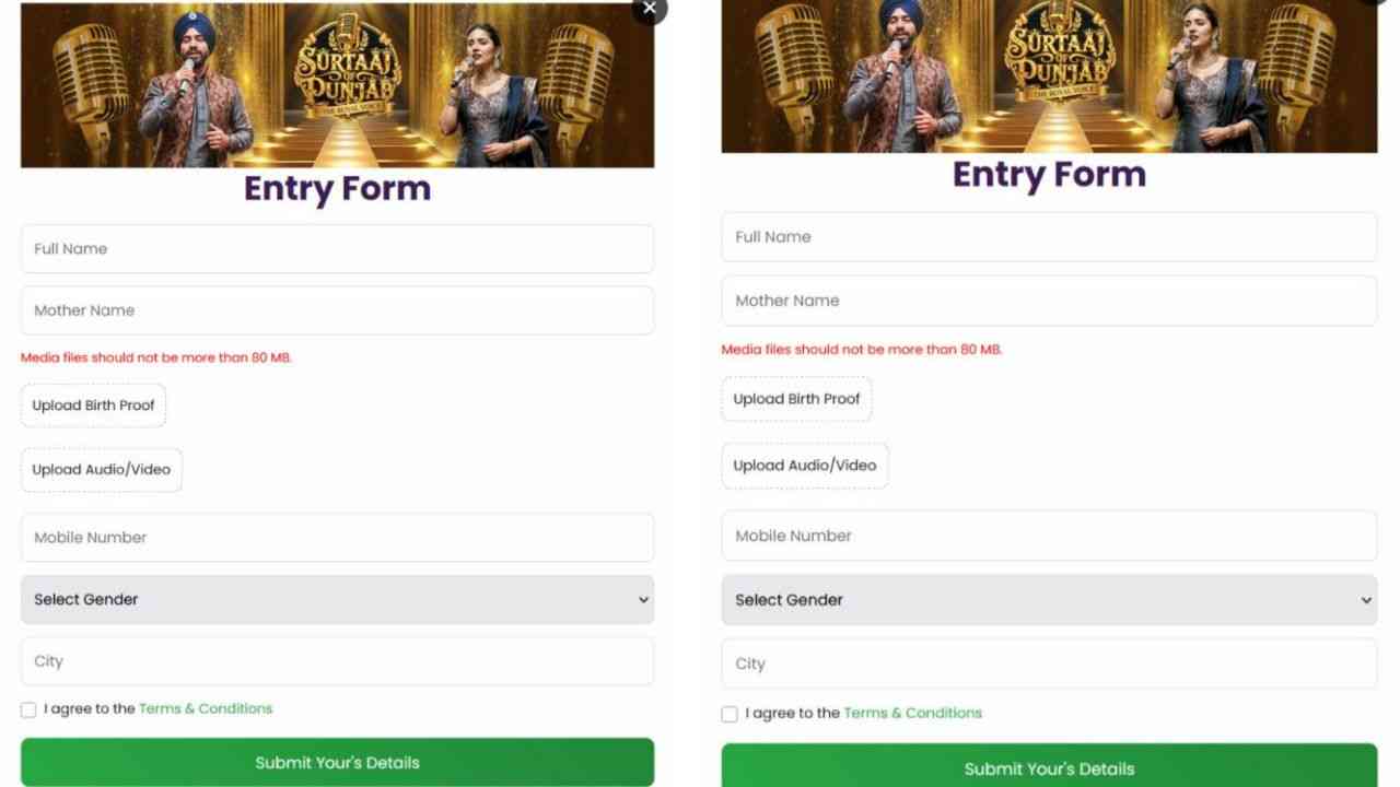 ਜਿਸ ‘ਚ ਤੁਹਾਡੀ  ਉਮਰ ਦਾ ਪ੍ਰਮਾਣ ਪੱਤਰ, ਨਾਮ ਤੇ ਪੂਰਾ ਪਤਾ, ਮੋਬਾਈਲ ਨੰਬਰ ਅਤੇ ਸ਼ਹਿਰ ਦਾ ਨਾਮ ਭੇਜਣਾ ਹੋਵੇਗਾ । ਇਸ ਦੇ ਨਾਲ ਤੁਹਾਨੂੰ ਆਪਣੀ ਆਵਾਜ਼ ‘ਚ ਗਾਏ ਗੀਤ ਦਾ ਇੱਕ ਮਿੰਟ ਦਾ ਵੀਡੀਓ ਵੀ ਭੇਜਣਾ ਹੋਵੇਗਾ। ਸੋ ਤੁਹਾਡੇ ‘ਚ ਵੀ ਹੈ ਟੈਲੇਂਟ ਅਤੇ ਤੁਸੀਂ ਵੀ ਆਪਣੀ ਗਾਇਕੀ ਦੇ ਹੁਨਰ ਨੂੰ ਦੁਨੀਆ ਭਰ ‘ਚ ਵਿਖਾਉਣਾ ਚਾਹੁੰਦੇ ਹੋ ਤਾਂ ਫਿਰ ਦੇਰ ਕਿਸ ਗੱਲ ਦੀ ਹੈ। ਅੱਜ ਹੀ ਸਾਨੂੰ ਭੇਜੋ ਆਪਣੀ ਡਿਟੇਲ । ਆਪਣੀ ਡਿਟੇਲਸ ਨੂੰ ਤੁਸੀਂ ਹੇਠ ਲਿਖੇ ਵਾਟਸਐਪ ਨੰਬਰ 9319638877‘ਤੇ ਵੀ ਭੇਜ ਸਕਦੇ ਹੋ ।