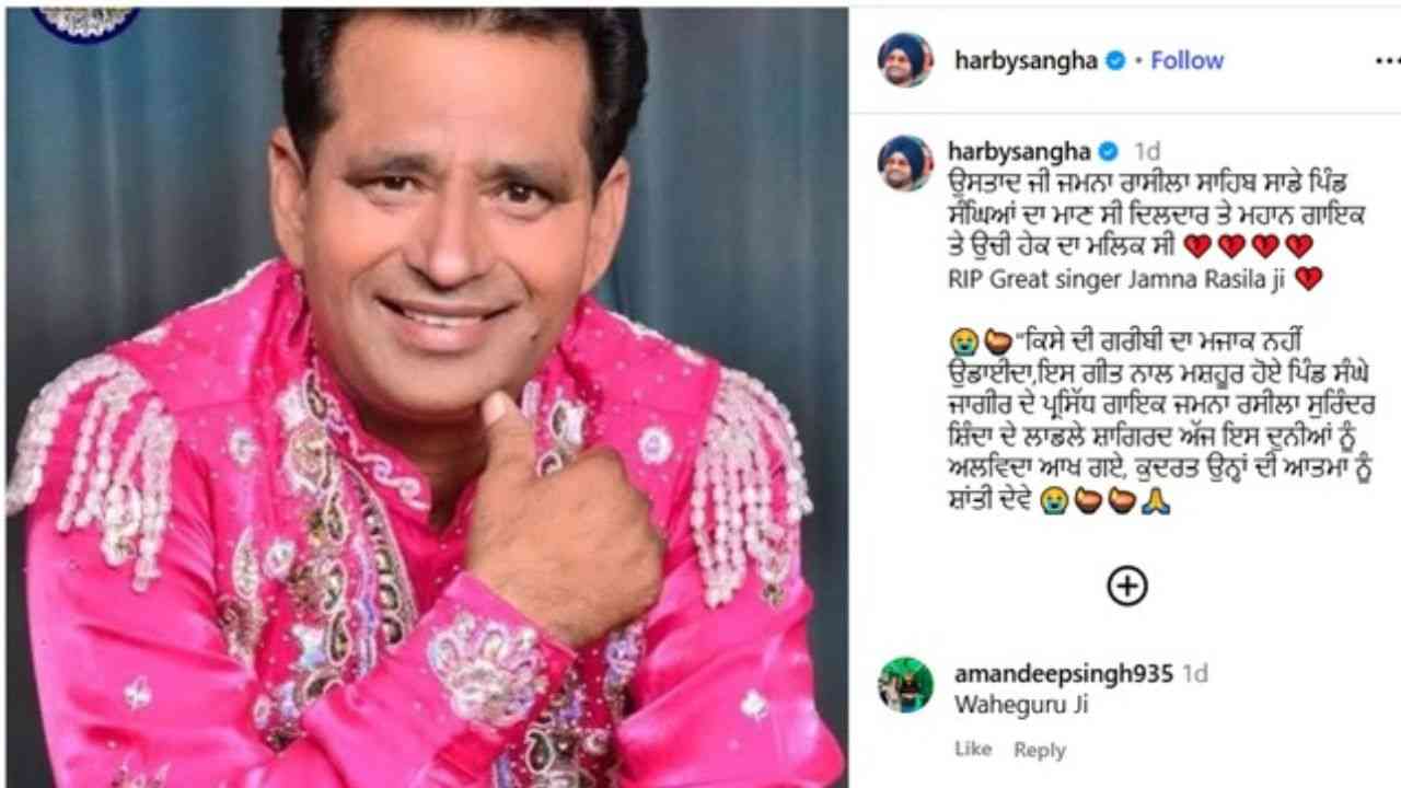 "ਕਿਸੇ ਦੀ ਗਰੀਬੀ ਦਾ ਮਜਾਕ ਨਹੀਂ ਉਡਾਈਦਾ,ਇਸ ਗੀਤ ਨਾਲ ਮਸ਼ਹੂਰ ਹੋਏ ਪਿੰਡ ਸੰਘੇ ਜਾਗੀਰ ਦੇ ਪ੍ਰਸਿੱਧ ਗਾਇਕ ਜਮਨਾ ਰਸੀਲਾ ਸੁਰਿੰਦਰ ਸ਼ਿੰਦਾ ਦੇ ਲਾਡਲੇ ਸ਼ਾਗਿਰਦ ਅੱਜ ਇਸ ਦੁਨੀਆਂ ਨੂੰ ਅਲਵਿਦਾ ਆਖ ਗਏ, ਕੁਦਰਤ ਉਨ੍ਹਾਂ ਦੀ ਆਤਮਾ ਨੂੰ ਸ਼ਾਂਤੀ ਦੇਵੇ” । ਜਿਉਂ ਹੀ ਹਾਰਬੀ ਸੰਘਾ ਨੇ ਇਸ ਪੋਸਟ ਨੂੰ ਸਾਂਝਾ ਕੀਤਾ ਤਾਂ ਜਮਨਾ ਰਸੀਲਾ ਦੇ ਦਿਹਾਂਤ ‘ਤੇ ਫੈਨਸ ਦੇ ਨਾਲ-ਨਾਲ ਸੈਲੀਬ੍ਰੇਟੀਜ਼ ਨੇ ਵੀ ਡੂੰਘੇ ਦੁੱਖ ਦਾ ਪ੍ਰਗਟਾਵਾ ਕੀਤਾ ਹੈ।