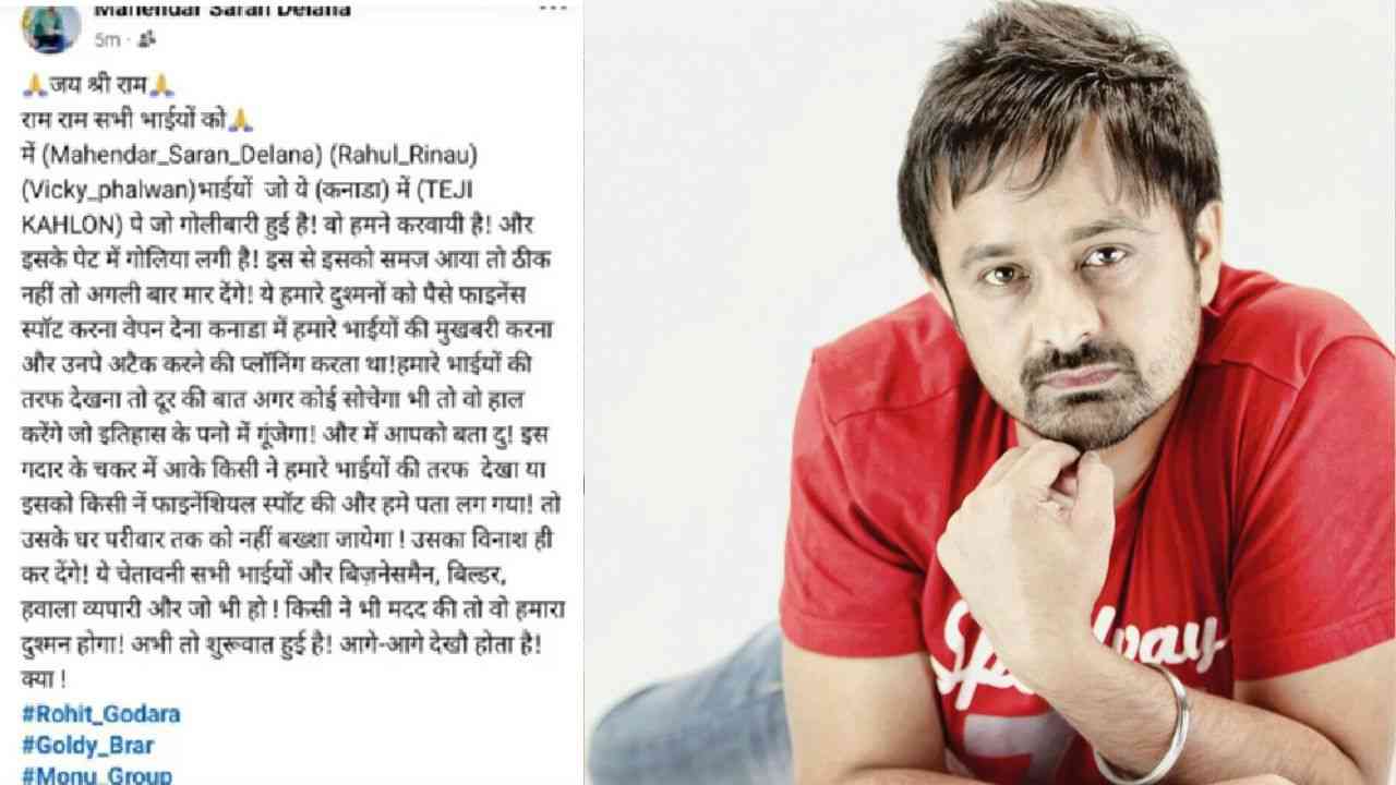 ਰੋਹਿਤ ਗੋਦਾਰਾ ਨਾਲ ਜੁੜੇ ਗੈਂਗਸਟਰ ਮਹਿੰਦਰ ਸਰਨ ਨੇ ਸੋਸ਼ਲ ਮੀਡੀਆ ਪੋਸਟ ਵਿੱਚ ਲਿਖਿਆ: "ਜੈ ਸ੍ਰੀ ਰਾਮ, ਰਾਮ ਰਾਮ ਸਭ ਭਾਈਆਂ ਨੂੰ। ਮੈਂ (ਮਹਿੰਦਰ ਸਰਨ ਦਿਲਾਣਾ) (ਰਾਹੁਲ_ਰਿਨਾਉ) (ਵਿੱਕੀ_ਫਲਵਾਨ) ਭਾਈਆਂ—ਜੋ ਗੋਲਾਬਾਰੀ (ਕੈਨੇਡਾ) ਵਿੱਚ (ਤੇਜੀ ਕਾਹਲੋਂ) ਤੇ ਹੋਈ ਹੈ, ਉਹ ਅਸੀਂ ਕਰਵਾਈ ਹੈ। ਉਸ ਦੇ ਪੇਟ ਵਿੱਚ ਗੋਲੀਆਂ ਲੱਗੀਆਂ ਹਨ। ਇਸ ਤੋਂ ਸਮਝ ਆ ਗਿਆ ਤਾਂ ਠੀਕ, ਨਹੀਂ ਤਾਂ ਅਗਲੀ ਵਾਰੀ ਮਾਰ ਦੇਵਾਂਗੇ!