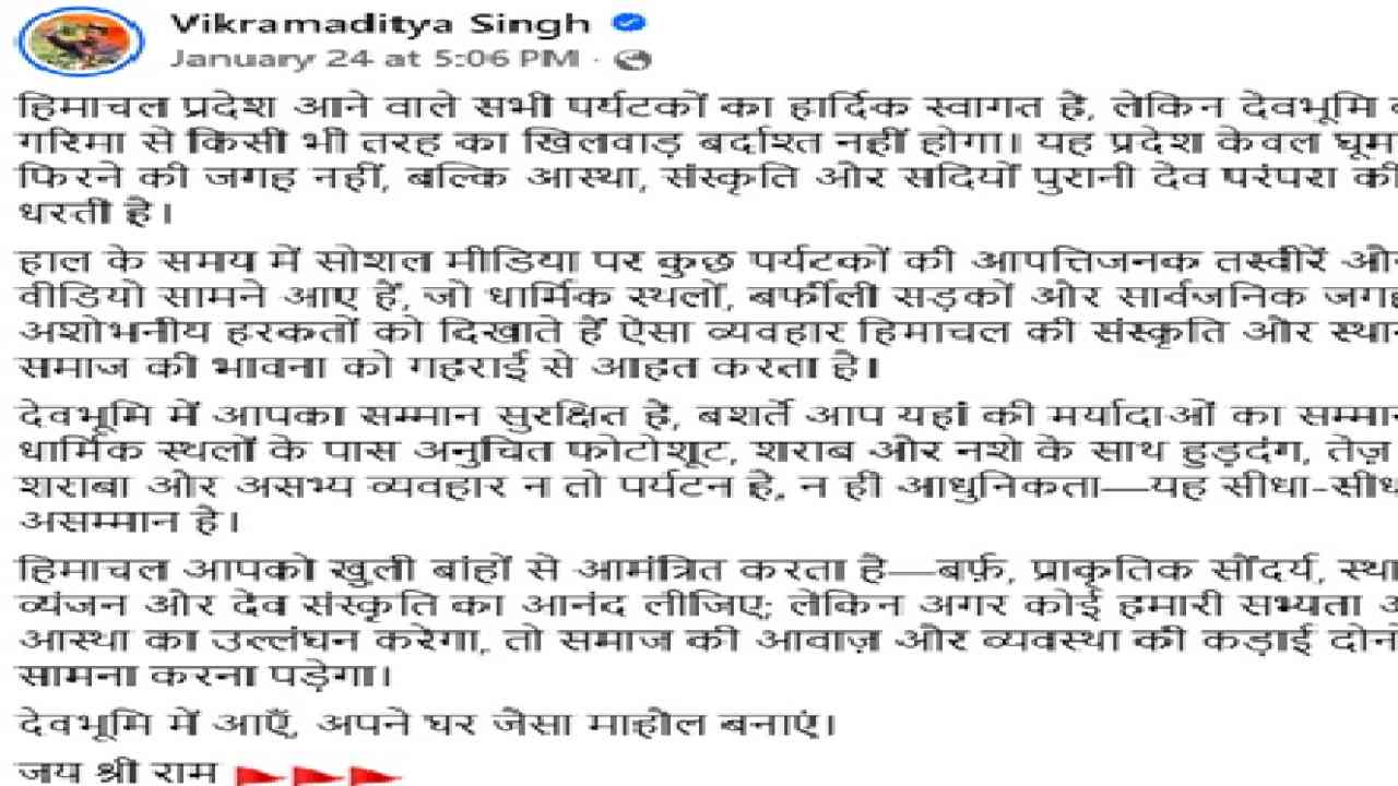 ਇਹ ਵੀਡੀਓ ਸਾਹਮਣੇ ਆਉਣ ਤੋਂ ਬਾਅਦ ਹਿਮਾਚਲ ਦੇ ਮੰਤਰੀ ਵਿਕਰਮਾਦਿਤਆ ਸਿੰਘ ਨੇ ਇਸ ਵੀਡੀਓ ਨੂੰ ਲੈ ਕੇ ਕਰੜਾ ਇਤਰਾਜ਼ ਜਤਾਇਆ ਹੈ। ਉਨ੍ਹਾਂ ਨੇ ਆਪਣੇ ਫੇਸਬੁੱਕ ਪੇਜ ‘ਤੇ ਨਰਾਜ਼ਗੀ ਜਤਾਉਂਦੇ ਹੋਏ ਲਿਖਿਆ ਕਿ “ਰੀਲ ਤੇ ਵਿਊਜ਼ ਦੇ ਨਾਮ ‘ਤੇ ਅਸ਼ਲੀਲਤਾ ਫੈਲਾਉਣ ਵਾਲਿਆਂ ‘ਤੇ ਸਖ਼ਤ ਕਾਰਵਾਈ ਹੋਣੀ ਚਾਹੀਦੀ ਹੈ”।ਵੀਡੀਓ ਬਨਾਉਣ ਵਾਲੀ ਮਹਿਲਾ ਦਾ ਮੇਘਾਰਾਣੀ-2556 ਨਾਮ ‘ਤੇ ਇੰਸਟਾਗ੍ਰਾਮ ਅਕਾਊਂਟ ਹੈ ਅਤੇ ਇਸ ‘ਤੇ ਮਹਿਲਾ ਦੇ 45.5 ਹਜ਼ਾਰ ਫਾਲੋਅਰਸ ਹਨ।